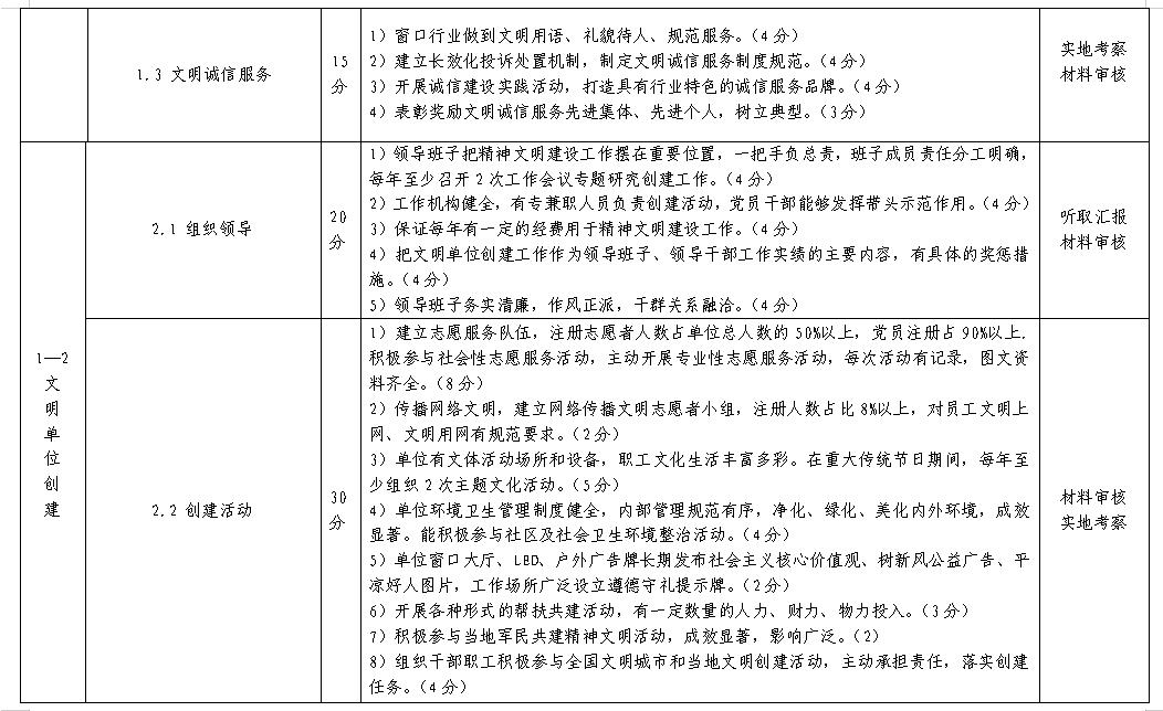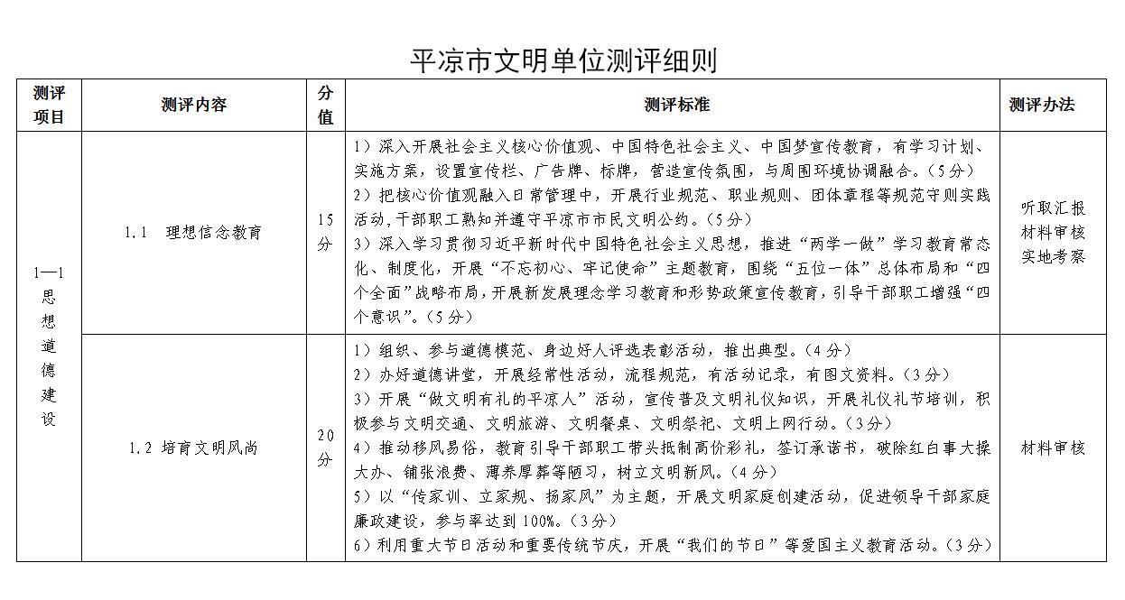 說 明 一、為規范市級文明單位考核測評工作,提高市級文明單位創建活動水平,參照《甘肅省文明單位測評細則》(2020年版),制訂本細則。 二、根據創建文明單位工作實際,測評細則共設置思想道德建設和文明單位創建兩大項目,5項測評內容,25條測評標準,滿分為100分。采用實地考察、材料審核、聽取匯報三種方法進行測評。 三、市級文明單位每兩年評選表彰一次,依據《平涼市文明單位測評細則》經測評產生。 四、申報單位申報前兩年內,有下列情形之一的,不得申報市級文明單位:1.領導班子主要負責人嚴重違紀、違法犯罪被查處,受到撤銷黨內職務(含)以上處分或行政撤職(含)以上處分,或被追究刑事責任;2.領導班子成員兩名(含)以上嚴重違紀、違法犯罪被查處,受到撤銷黨內職務(含)以上處分或行政撤職(含)以上處分,或被追究刑事責任;3.單位或單位法人被列為失信聯合懲戒對象或被列入嚴重失信違法“黑名單”;4.員工違法犯罪被追究刑事責任(員工不超過500人的單位,有3人(含)以上被追究刑事責任;員工超過500人的單位,有5‰(含)以上的員工被追究刑事責任。);5.發生重大安全生產責任事故;6.發生重大食品藥品安全事故;7.發生負面影響較大的群體性事件;8.發生社會影響惡劣的“黃毒賭”案件;9.發生社會影響惡劣的邪教活動;10.創建工作滑坡嚴重,失去示范引領作用;11.發生嚴重道德失范、造成社會惡劣影響的其他惡性事件或案件;12.發生形式主義、弄虛作假、擾民行為等問題。 五、被測評單位提供的檔案材料必須符合下列要求:1. 提供的檔案材料應為測評前兩個年度的資料;2. 檔案資料為電子文檔或紙質文件;3. 檔案資料須按“測評項目”分類編輯或裝訂成冊,并按“測評內容”編寫目錄,注明頁碼;4. 被測評單位不便涉及某項指標的,應書面說明情況。 六、本細則由平涼市精神文明建設指導委員會辦公室負責說明和解釋。