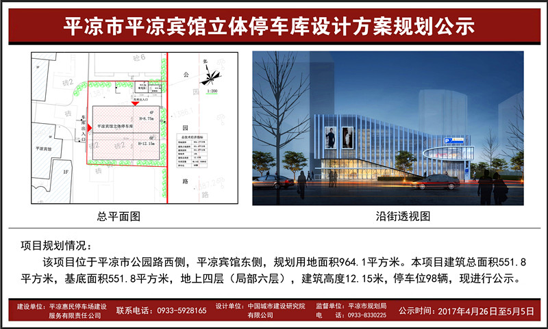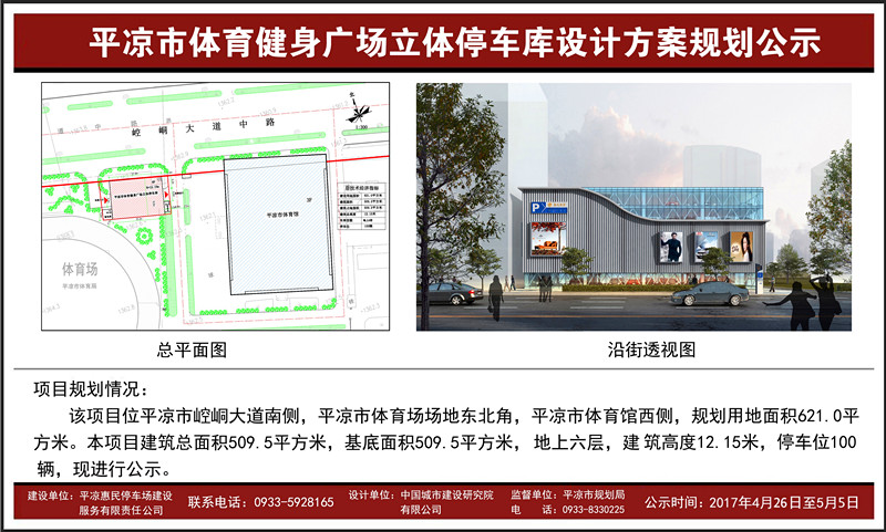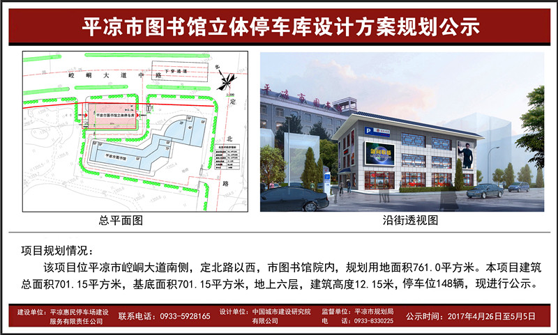 平涼賓館、體育健身廣場、市圖書館3處立體停車庫設計方案經市規劃局審查及市規委會2017年4月第一次會議審定通過。4月26日下午, 3處立體停車庫設計方案在規劃局網站上公示。