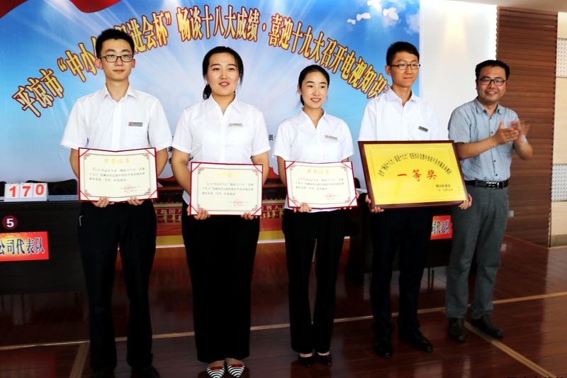 競賽結束后,伴隨著歡快的音樂聲,市委宣傳部副部長雷勇走上臺,為全市暢談十八大·喜迎十九大電視知識競賽中省駐平及市屬企業賽區第一名——平涼市惠民公司代表隊頒發一等獎獎牌和證書。