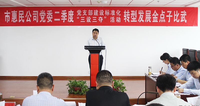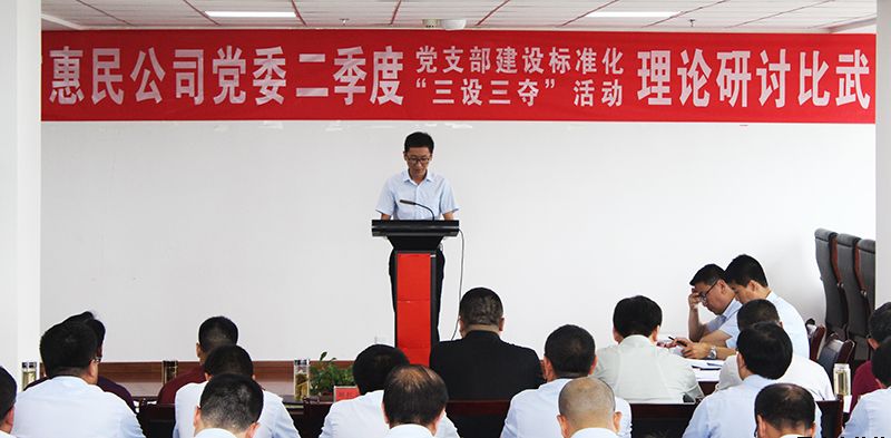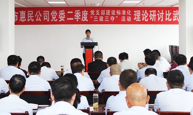 7月16日,市惠民公司黨委組織開展第二季度黨支部建設標準化“三設三奪”活動。公司黨委書記、董事長唐常寧,黨委委員、總經理胡紅訓出席活動,副總經理魏顯文主持活動。副總經理王徐周、鄭忠軍、馬新平、柳振源,總工程師高健,總經濟師王國太,中層干部及全體黨員共計60余人參加活動。