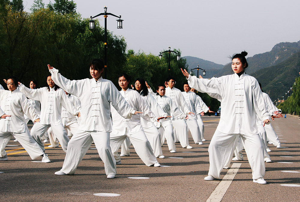 展演中,隨著舒緩的崆峒太極拳28式音樂,50多名參演人員身著白色太極拳服裝組成方隊,太極愛好者們由靜而動,表演動作整齊一致,一招一式,剛柔相濟,整個展演現場氣勢恢弘。