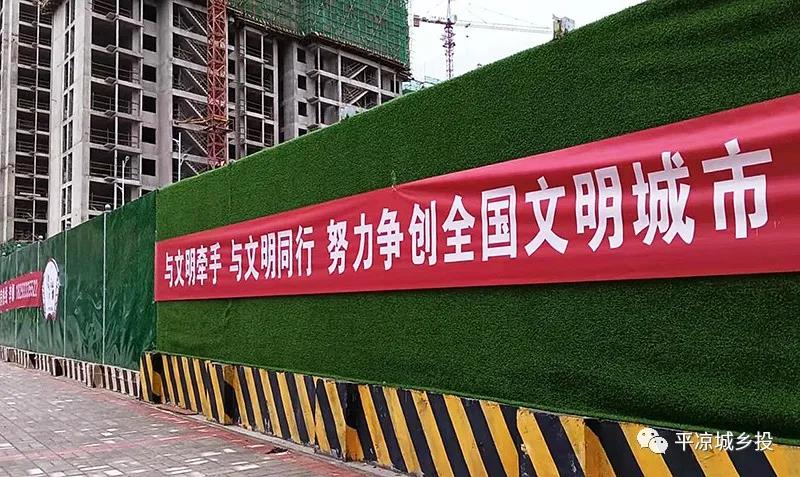 為了讓工地圍擋成為城市文明的一道風景線,房產公司用公益廣告及綠草皮扮靚建筑圍擋,并在項目現場懸掛多條宣傳橫幅。從社會主義核心價值觀到創建文明城市,以內容豐富的公益廣告為城市文明增色添彩。