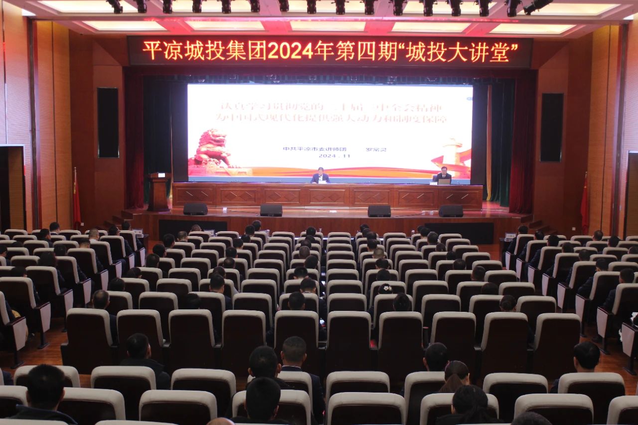 11月30日,集團公司舉辦2024年第四期“城投大講堂”。邀請中共平涼市委講師團副團長羅常靈同志圍繞《認真學習貫徹黨的二十屆三中全會精神,為中國式現代化提供強大動力和制度保障》作專題宣講。集團公司領導班子成員,各部門、下屬各二級公司班子成員、三級公司負責人,全體黨員及職工代表共計240余人聆聽了大講堂。