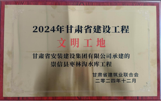 近期,由全過程咨詢公司監理的崇信縣棗林溝水庫工程榮獲“2024年甘肅省水利工程文明工地”“2024年甘肅省建筑業綠色建造施工水平評價合格”稱號。