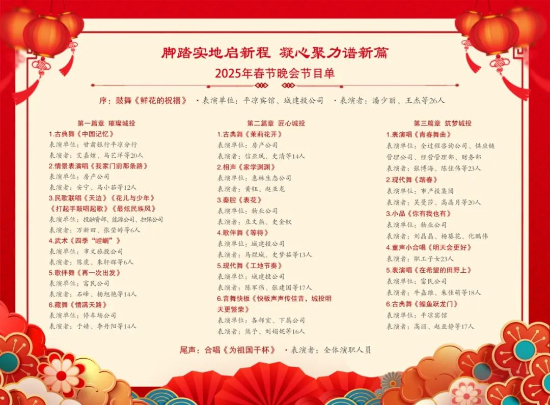 節(jié)目由集團公司各部室、下屬各公司精心編排,邀請甘肅銀行平?jīng)龇中小⑹挟a(chǎn)投、市文旅投公司傾情助演,全面展示了集團公司在深化改革、轉(zhuǎn)型發(fā)展中取得的輝煌成就以及干部職工勇?lián)姑^勇爭先、攻堅克難、真抓實干、昂揚向上的精神風貌。