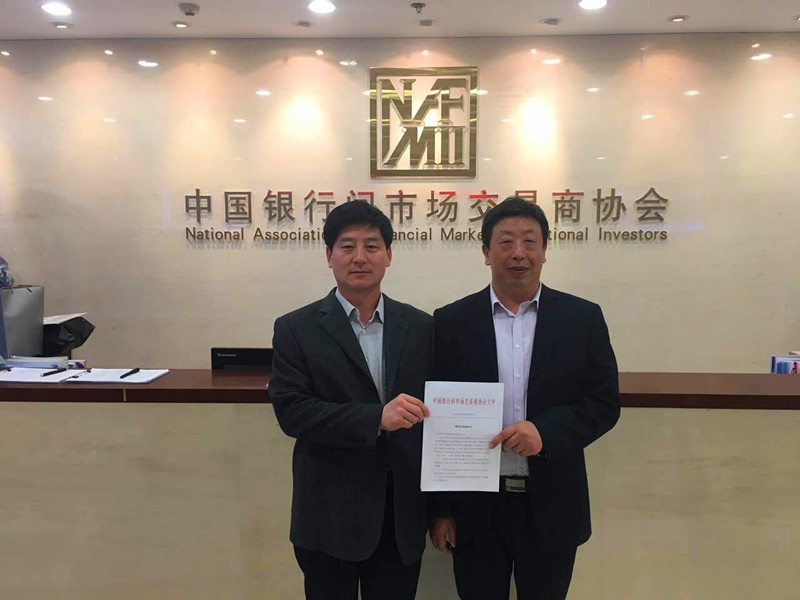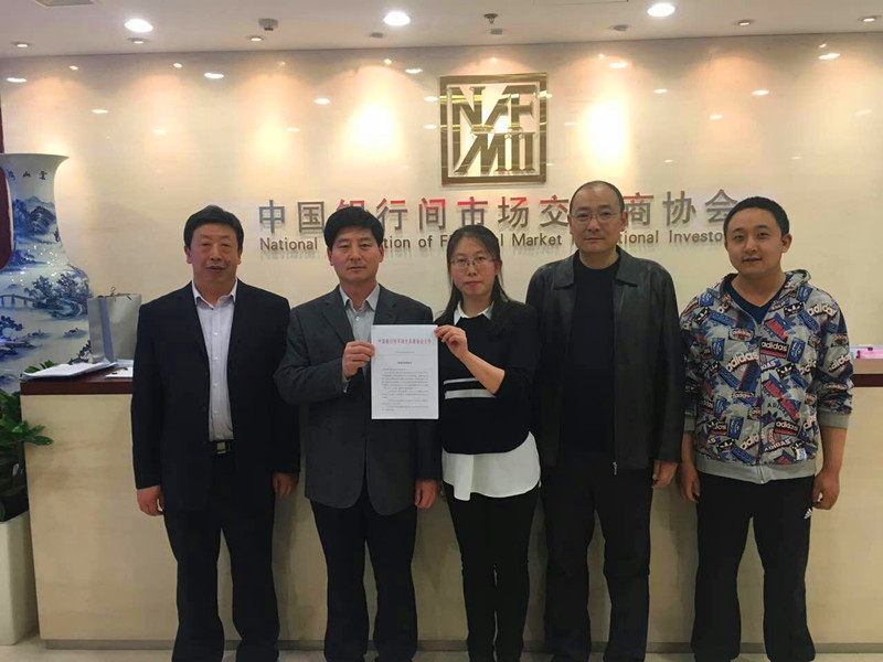 副總經(jīng)魏顯文(左二)和融資部、財(cái)務(wù)部部長王國太(左一)成功領(lǐng)取中國銀行間市場交易商協(xié)會(huì)非公開定向債務(wù)融資工具注冊通知書