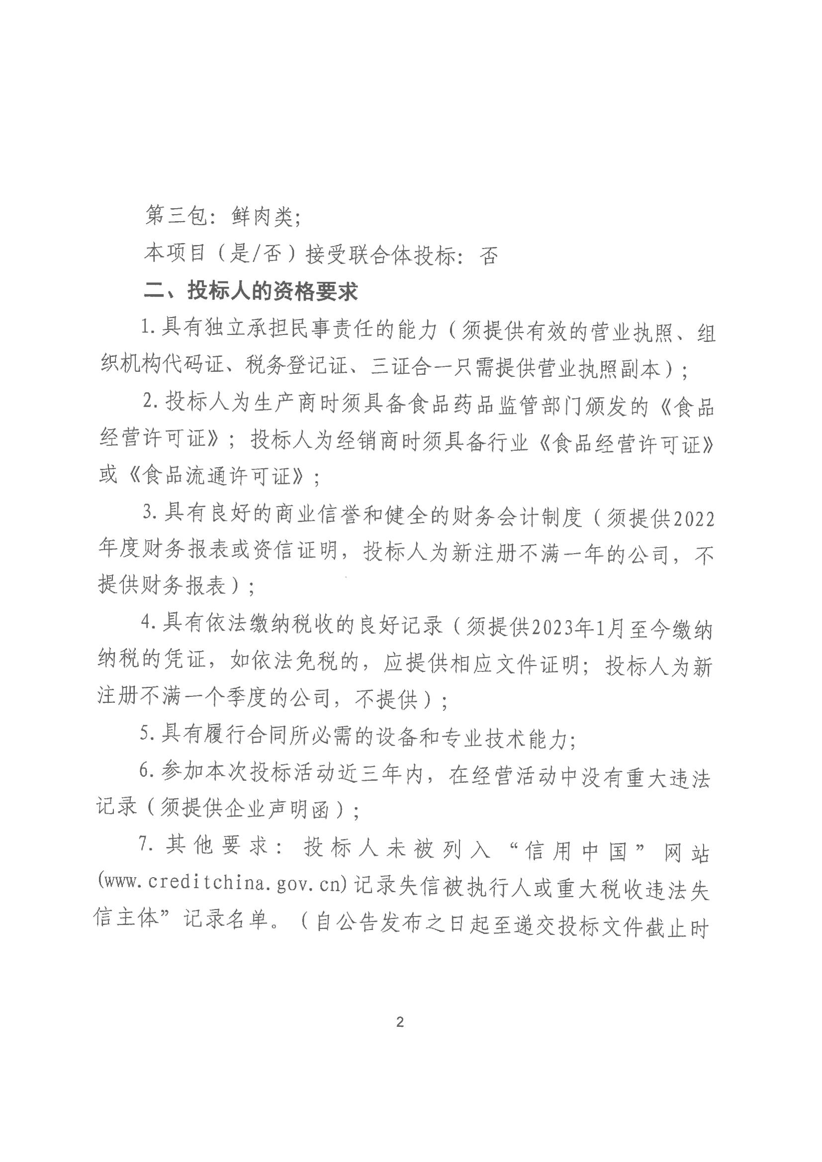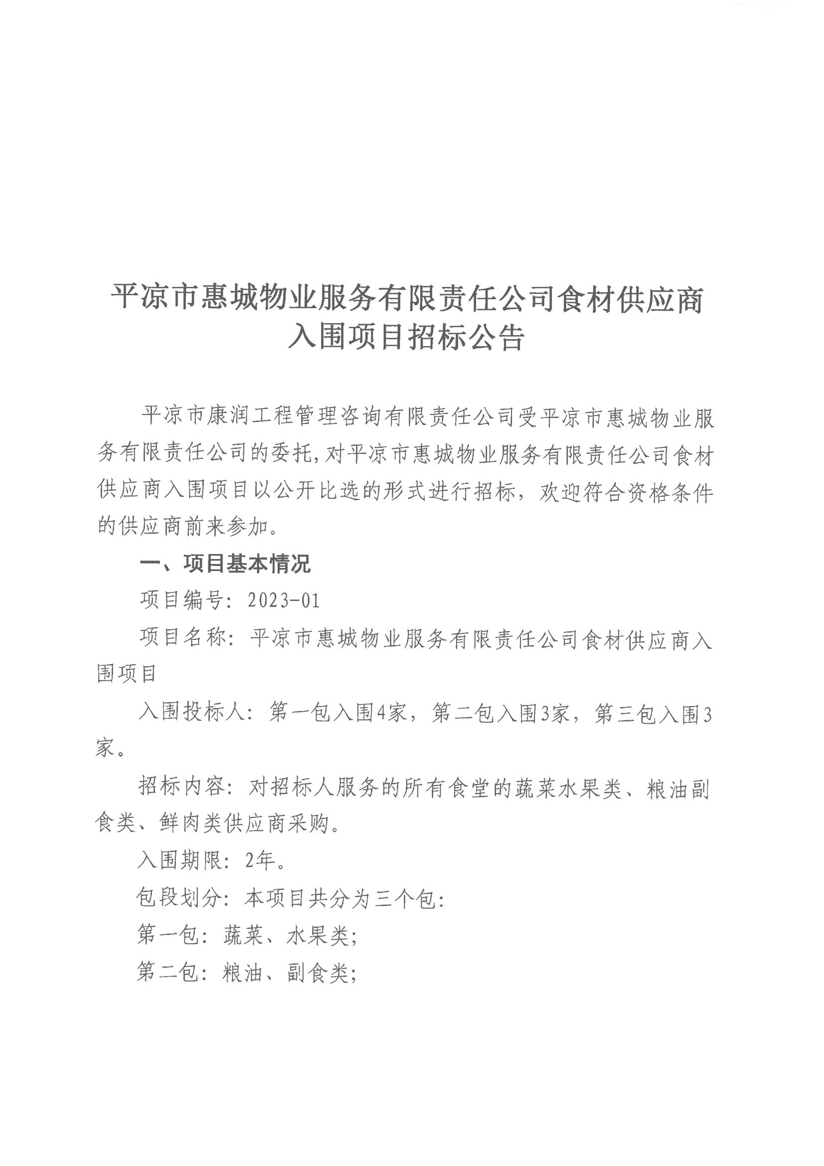 平涼市惠城物業服務有限責任公司食材供應商入圍項目結果公告