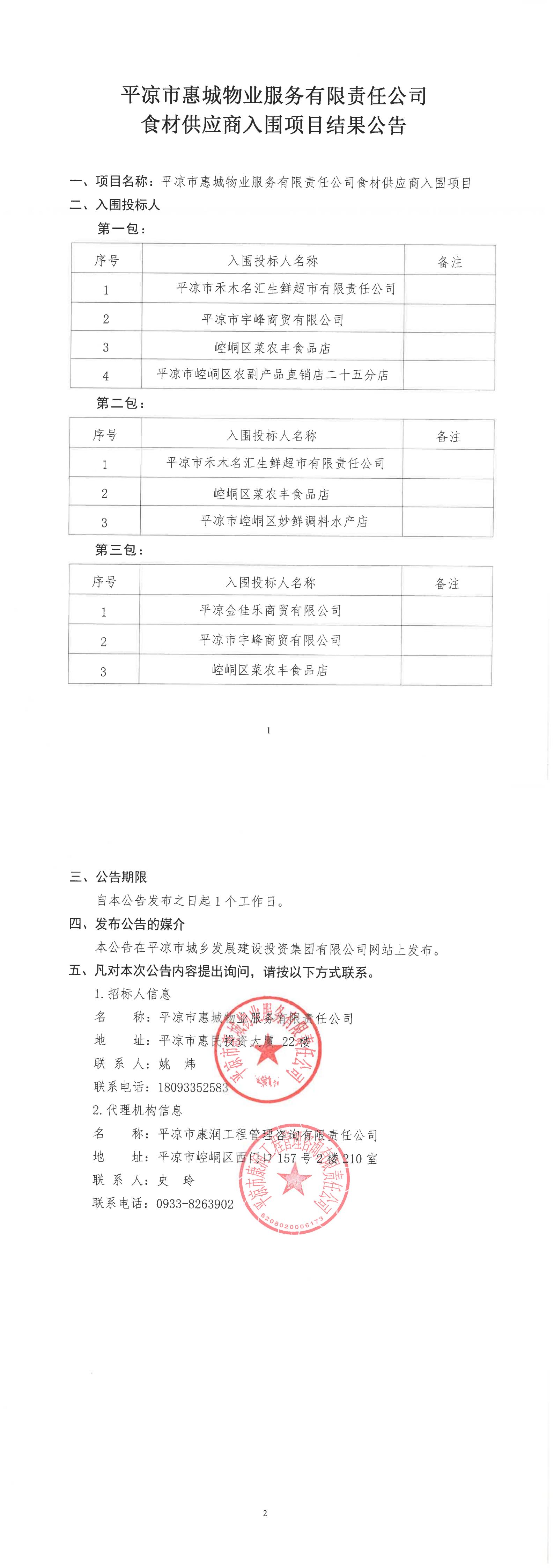 平涼市惠城物業服務有限責任公司食材供應商入圍項目結果公告